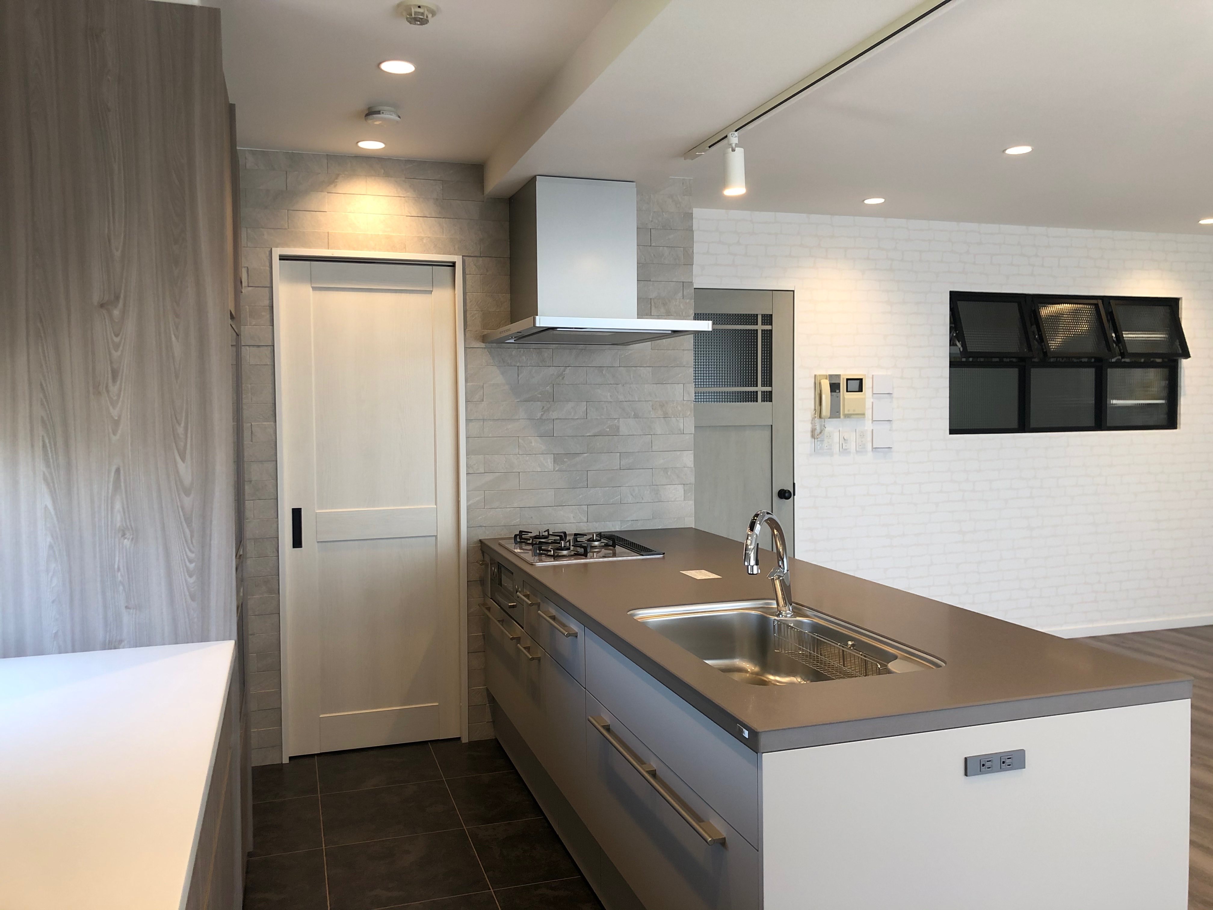 キッチンの壁はエコカラット張りに〜